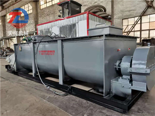 雙軸加濕攪拌機的工作原理:當干粉材料由給料機定量通過進料口均勻進入槽時,動力傳動機械驅(qū)動裝有多組葉片的螺旋主軸旋轉(zhuǎn),通過嚙合傳動齒輪驅(qū)動被動螺旋軸與主軸等速相對旋轉(zhuǎn),使物料攪拌并推入槽加濕段。物料推入加濕段后,加濕器自動噴濕物料,然后充分攪拌槽后的攪拌段。當物料達到可控濕度時,